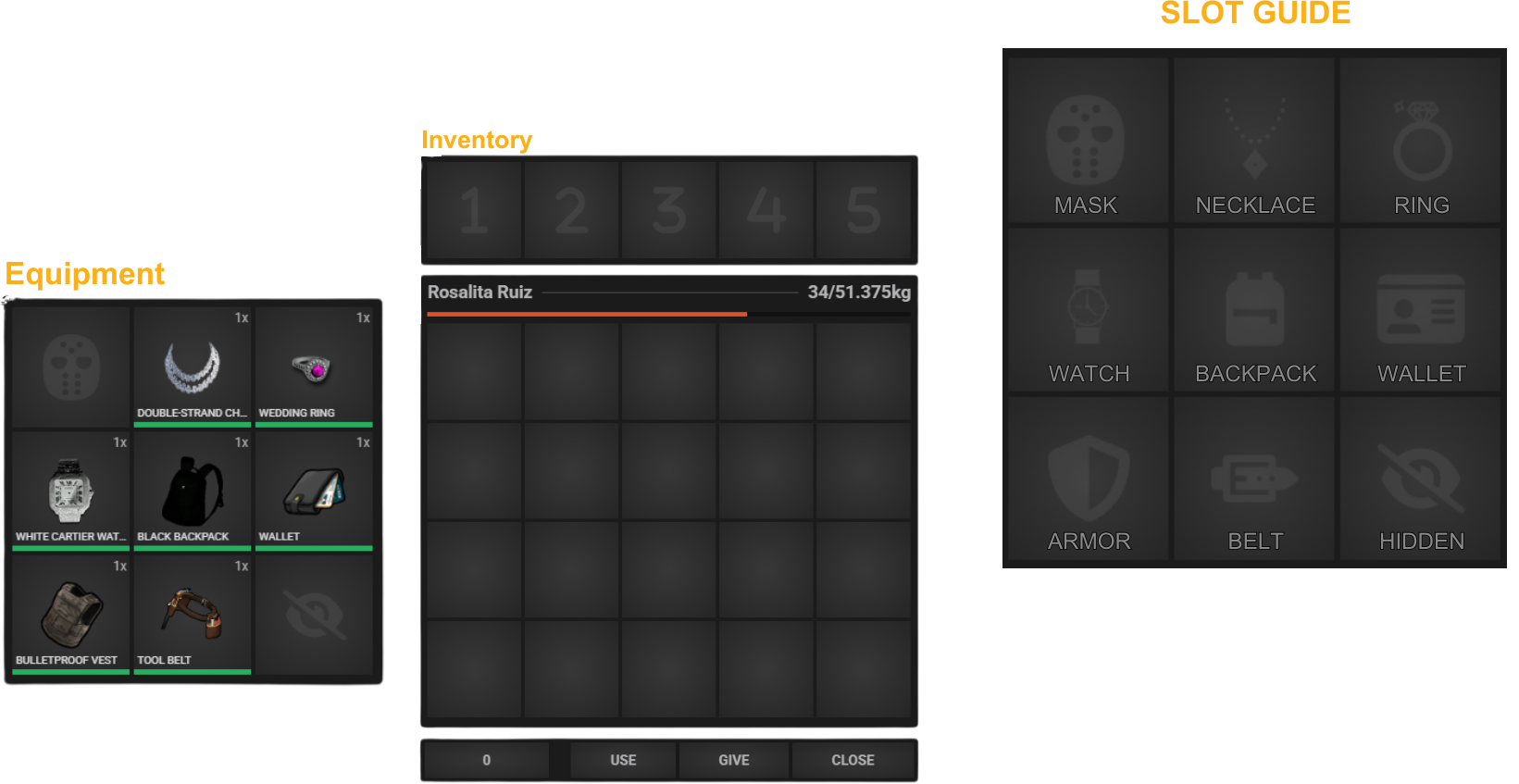 WEIGHT & SLOTS - How much you can carry is determined by the number of available slots and the weight of the items in your inventory. Different items weigh different amounts. In the above image, Rosalita is sitting at 34/51.375kg.