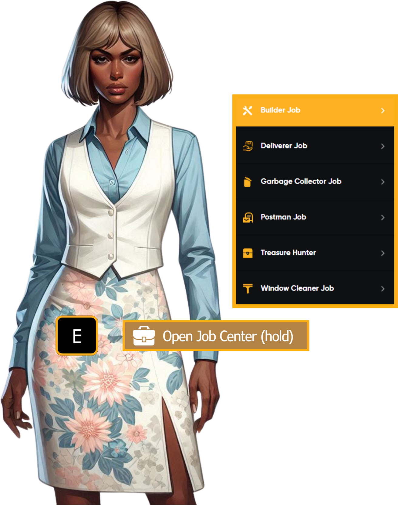 | Every new character gets $5000 starter cash, but this won't go very far when you need to eat, drink, repair, etc. At some point, we all need a job. At Postal 738 (marked by a briefcase on the map), inside number 4 Alta Street, you'll find another local lady who runs the city job center. Walk up to her, and when the interact prompt appears, hold your ‘E’ key. If no interaction prompt appears, hit ‘Alt’ on your keyboard to toggle visibility. All the current city jobs are listed here. Select the one you'd like to try, and a GPS marker will be added to your map to indicate the start location for the job. Player-owned businesses advertise job vacancies using Birdy (in city) and via the B⭐Discord. Discord vacancies can be found in the 📚⋮ic⋆business⋆resources channel. Or… you can always try fishing, mining, scavenging, or metal detecting as alternative ways of making some cash. |