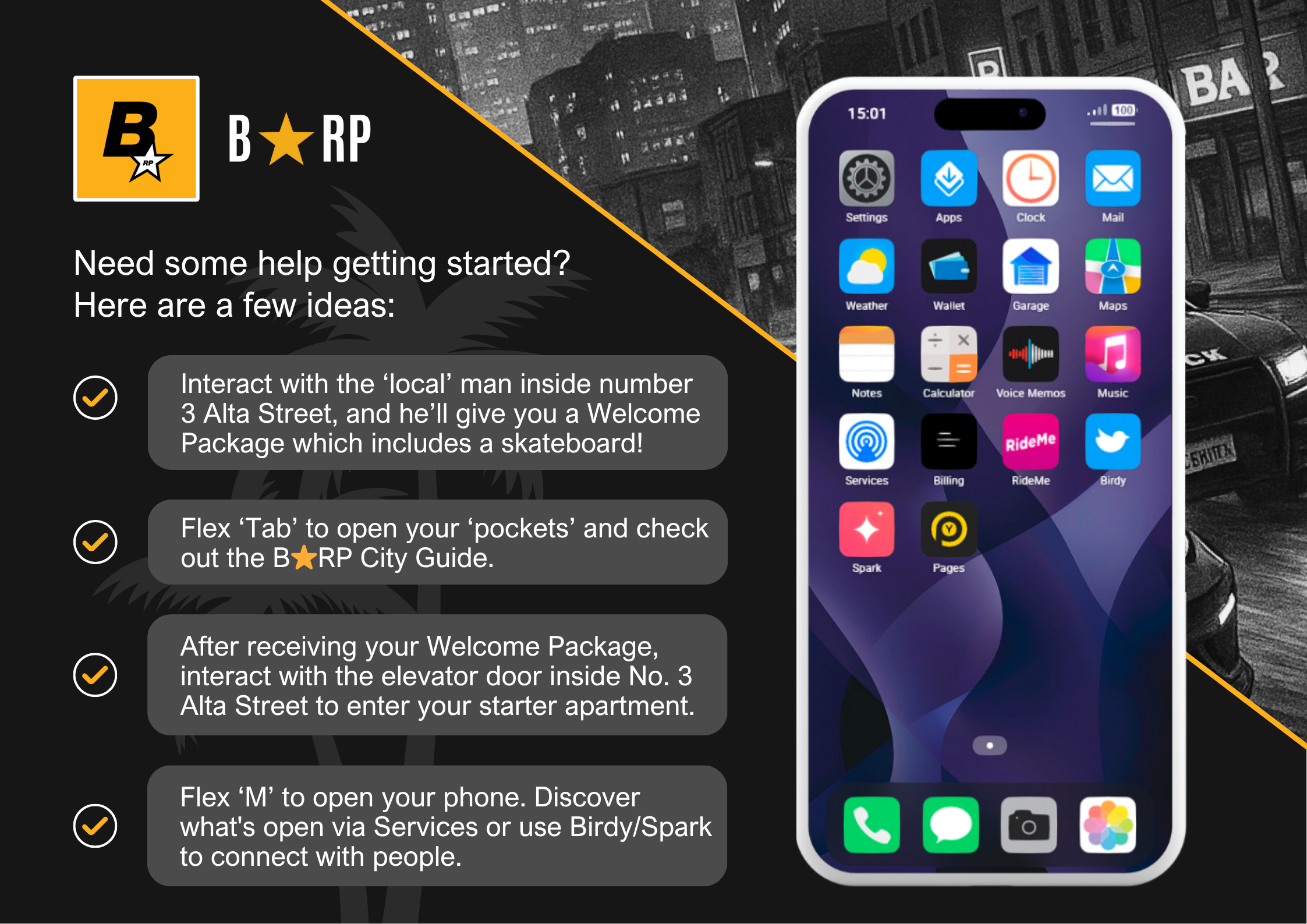 Introduce Yourself To Everyone - B⭐ is a very friendly place; we welcome new residents and those new to roleplay. Introduce yourself, engage in conversation, ask questions, and take the time to get to know the people you meet. If you get on, get their phone number and plan additional activities.