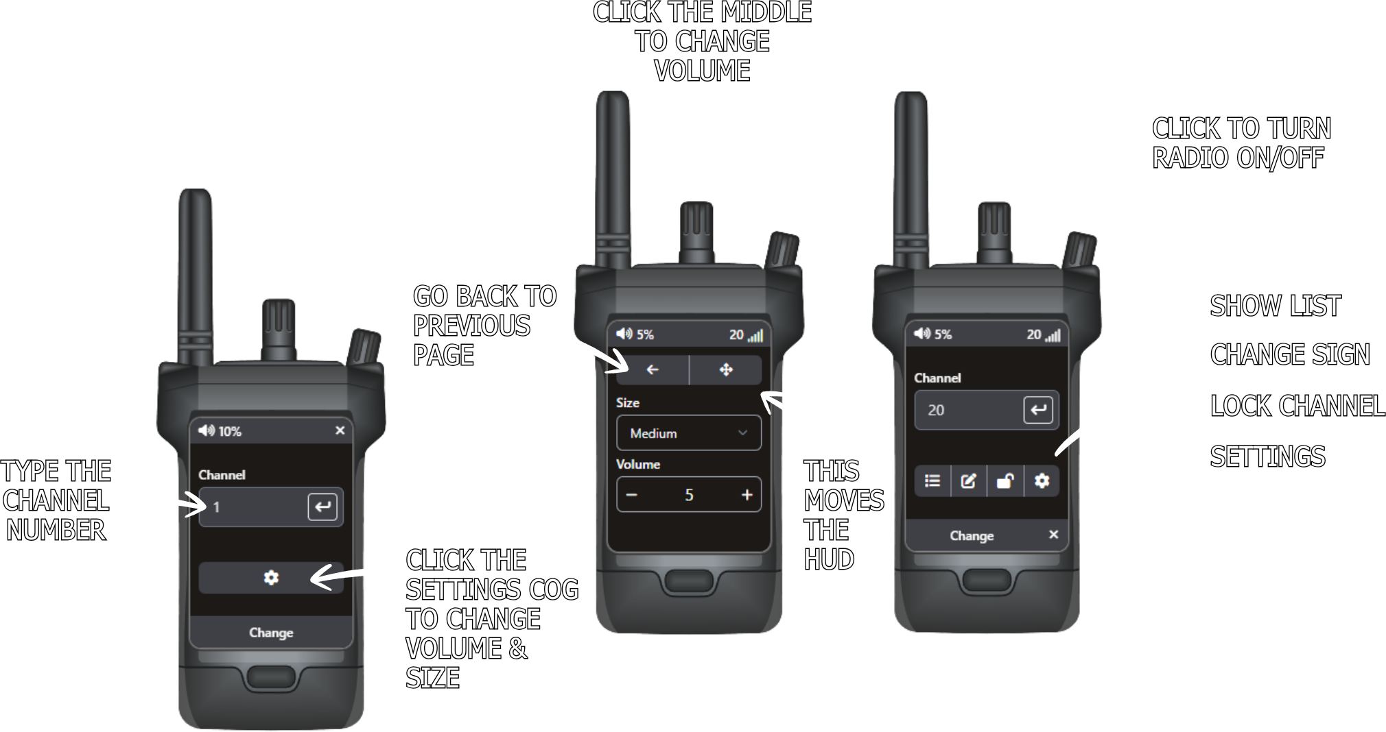 OPENING YOUR RADIO - If your radio is in one of your 1-5 hotkeys, press that key to open your radio. If it isn't, open your inventory and right-click it, select ‘use’ from the drop-down, or drag it to the ‘USE’ option at the bottom of your inventory. CONNECTING & USING YOUR RADIO - The diagram to the right shows an open radio and all the buttons, where to type the channel, etc. Most options have a hover tooltip that appears when you hover your mouse cursor over them. |